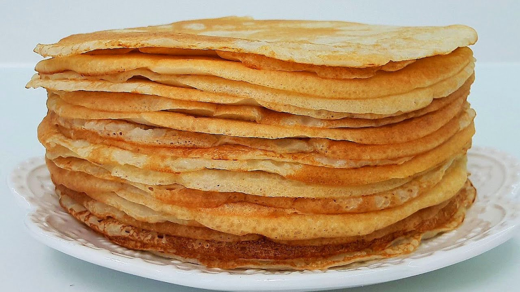 Наливаємо тісто, смажимо млинці на сильному вогні з двох боків до золотистого кольору і складаємо стопкою. Смажимо ~40 секунд з одного боку та ~20 секунд з іншого.