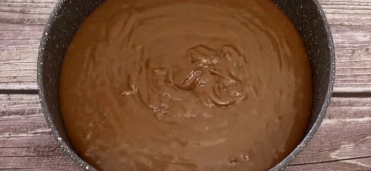 - Борошно, розпушувач та какао змішуємо і просіюємо в яєчну масу. Змішуємо міксером. Переливаємо у форму 18 см та випікаємо 30 хв, при темпі 180 гр.