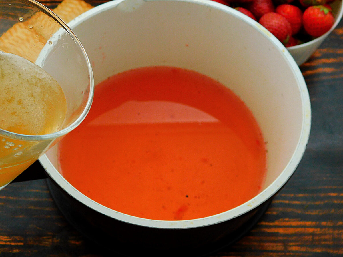 9. Перелити в сотейник, підігріти до розчинення цукру, але не кип’ятити. Додати залишився желатин. Якщо полуниця не дуже соковита і рідини мало, підлити трохи води.