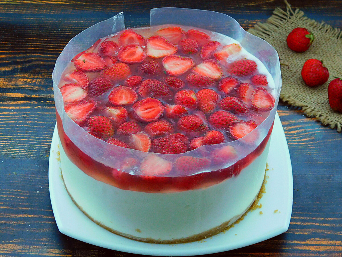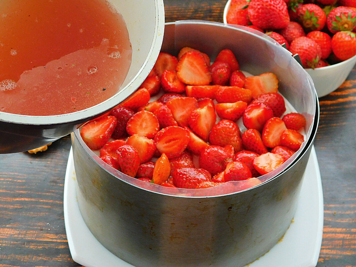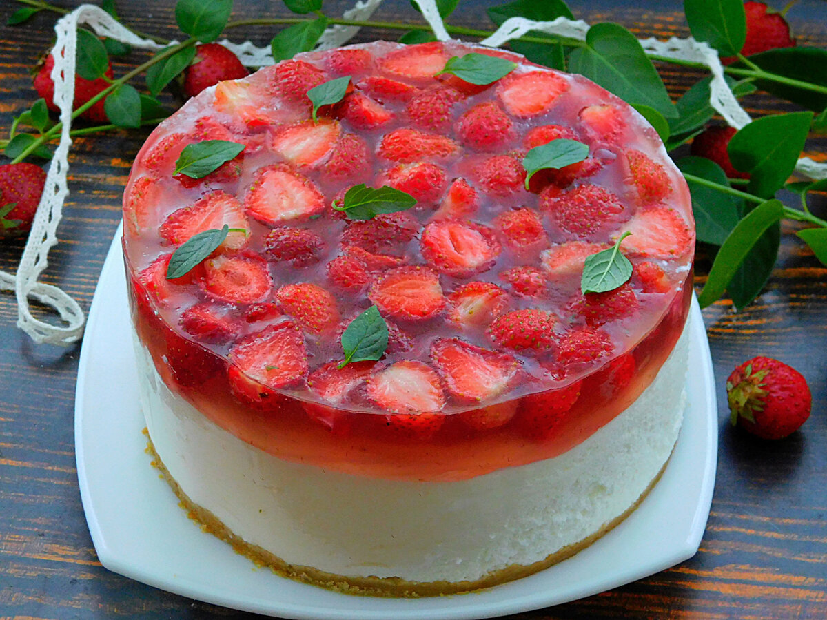 10. Полуницю викласти на застиглий чізкейк. Зверху акуратно вилити желе ( при необхідності остудити ).