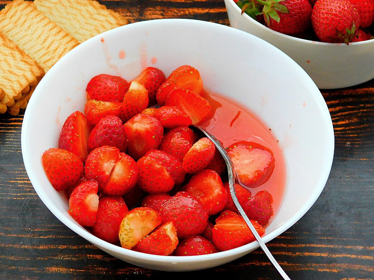 8. Полуницю помити, почистити і нарізати на 2-4 частини. Засипати цукром, що залишився, змішати і почекати 10 хвилин, щоб ягоди пустили сік.