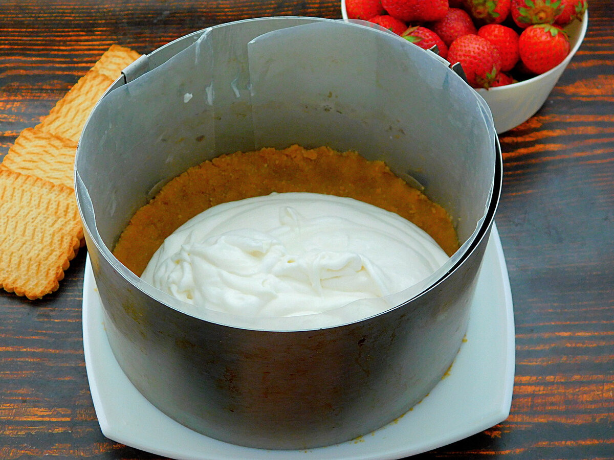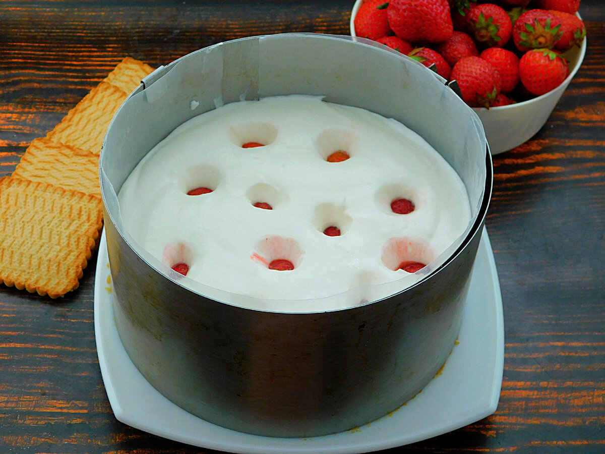 7. Розмістити кілька цілих ягід полуниці і втиснути всередину. Прибрати в холодильник, щоб сирний шар схопився.