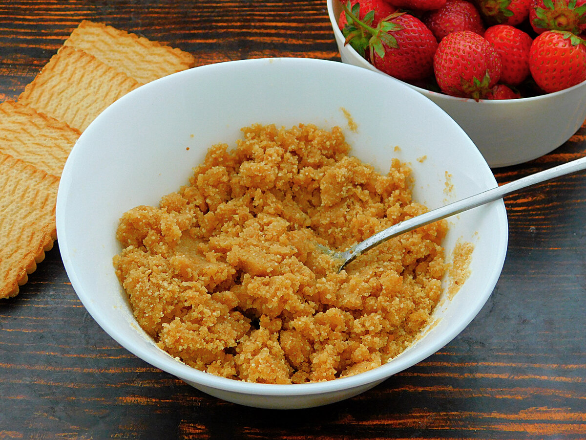 2. Пісочне печиво перетворити в крихту. Можна скористатися кухонним подрібнювачем або скласти в пакет і добре прокачати качалкою. Додати розтоплене вершкове масло.