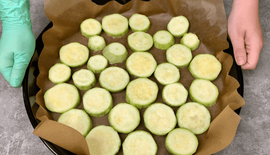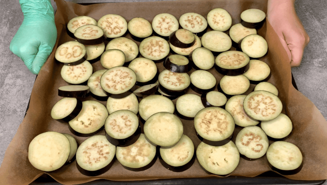 1. Баклажани і кабачки нарізаємо кружальцями, злегка побризкуємо олією і запікаємо 15-20 хвилин за нормальної температури 200 градусів.