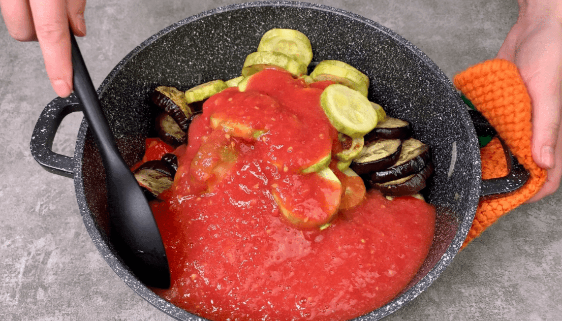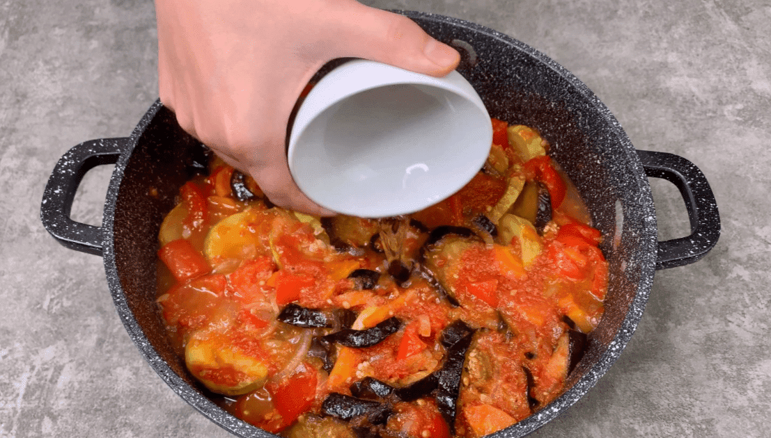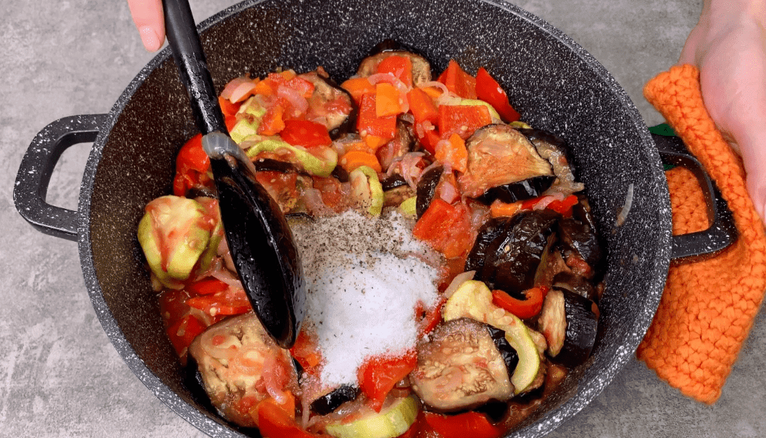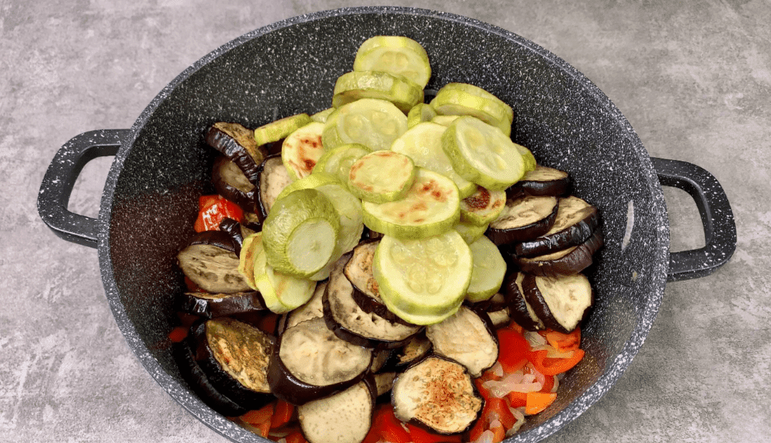 3. Через 5 хвилин додаємо запечені баклажани та кабачки.