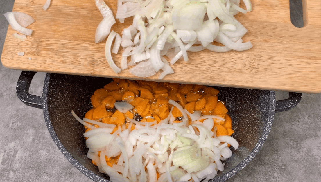 2. У каструлі, на олії обсмажуємо моркву кружальцями 3-4 хвилини, потім додаємо цибулю чверть кільцями, смажимо ще 2-3 хвилини.