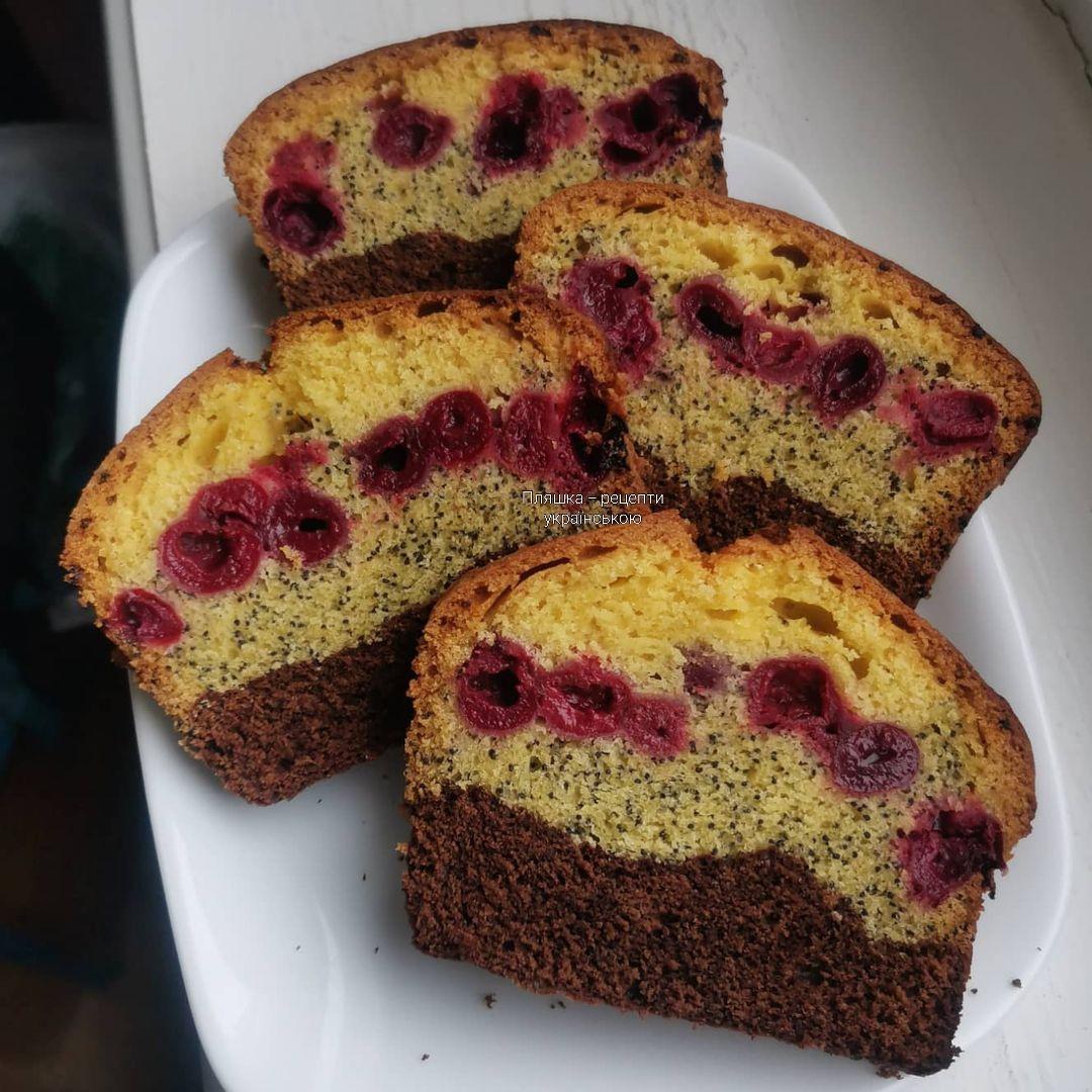Поверх макового тіста рівномірно розподілити вишню та злегка втиснути її в тісто.
