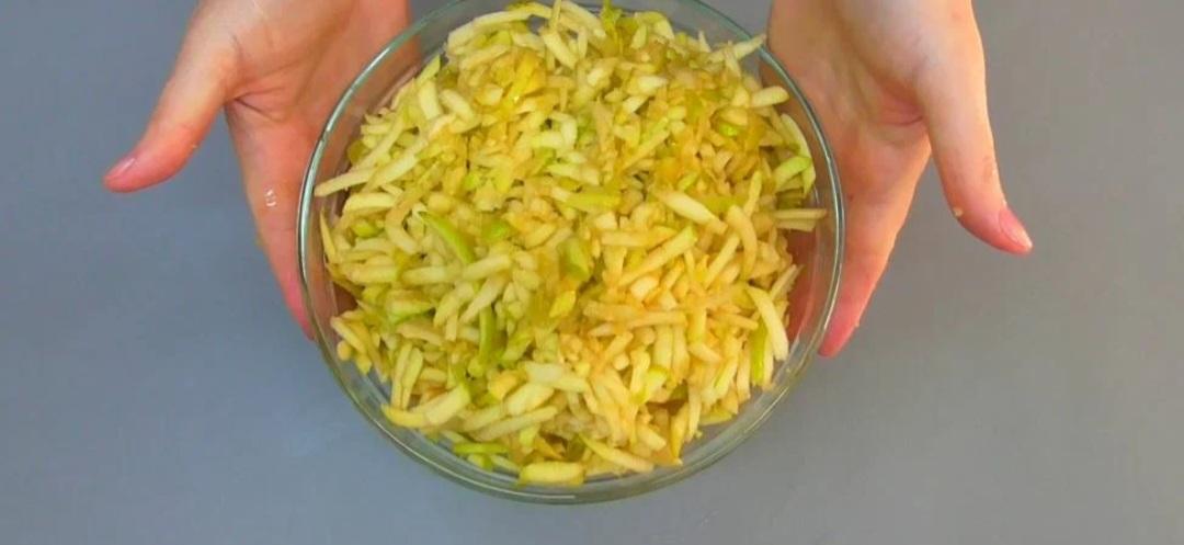 - Яблука можна натерти на великій тертці або нарізати дрібними кубиками. До яблук можна додавати й інші не дуже водянисті фрукти, ягоди.