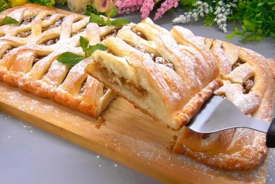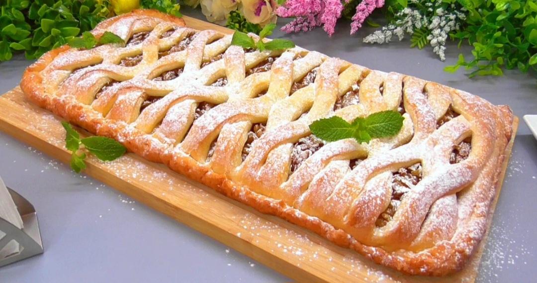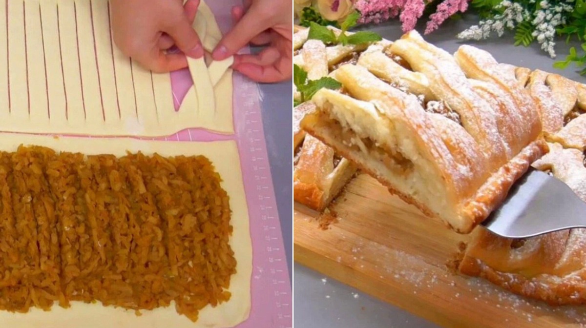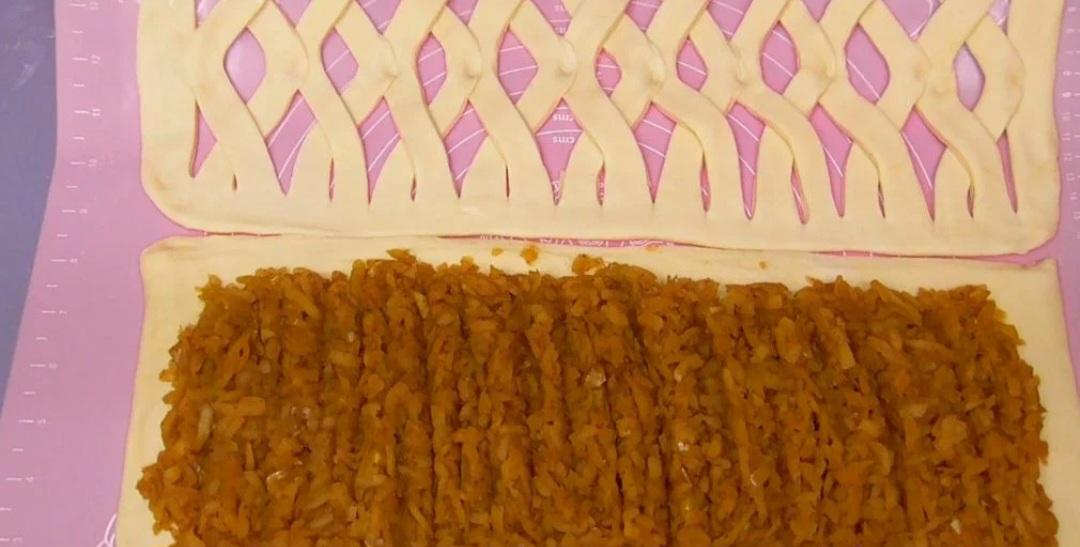 - Не вдається зробити форму, як я показала — просто розкачайте звичайний пласт, накрийте нижній шар і зробіть надрізи зверху або прокол виделкою.