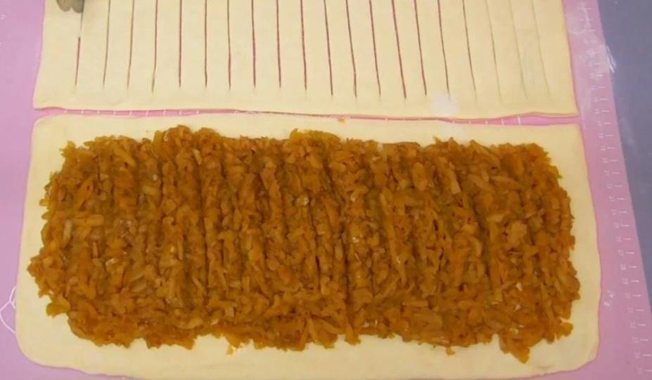 - Не вдається зробити форму, як я показала — просто розкачайте звичайний пласт, накрийте нижній шар і зробіть надрізи зверху або прокол виделкою.