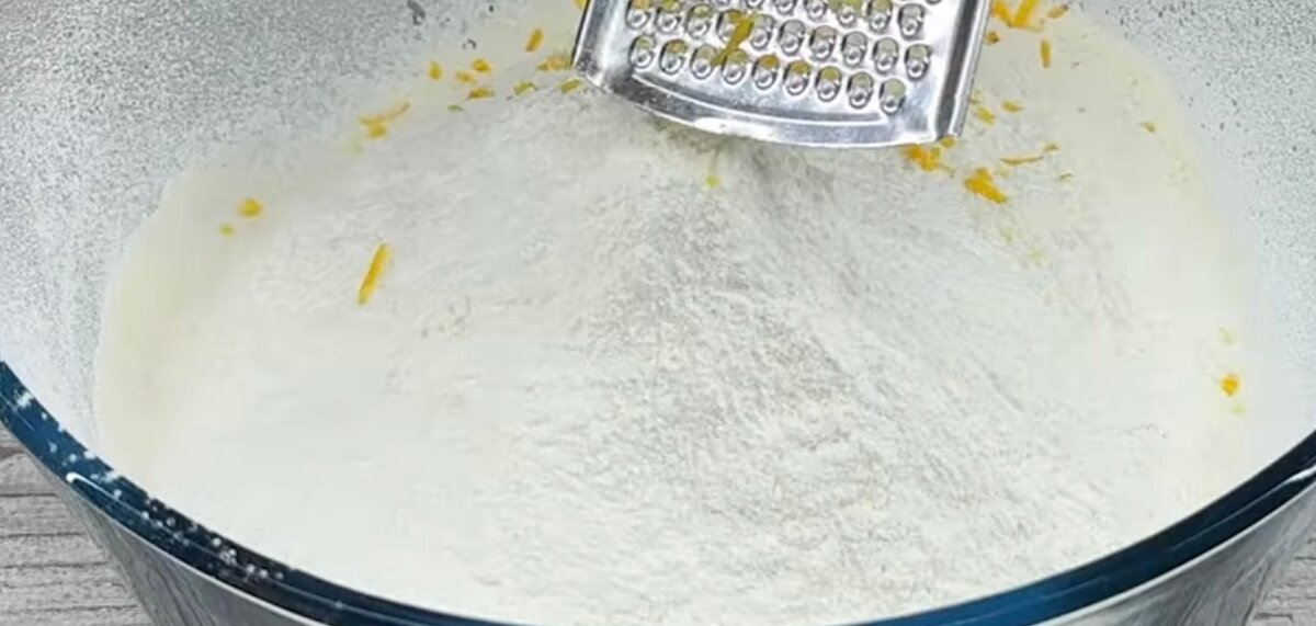 У чисту ємність просіюємо борошно, додаємо сіль і натираємо на дрібній терці цедру лимона.