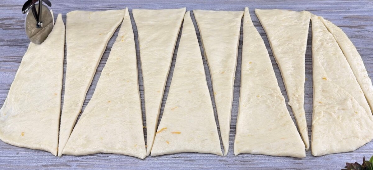 Кладемо на стіл і розтягуємо тісто руками в прямокутник 60х20 см. Нарізаємо трикутники ( у мене вийшло 9 штук ).