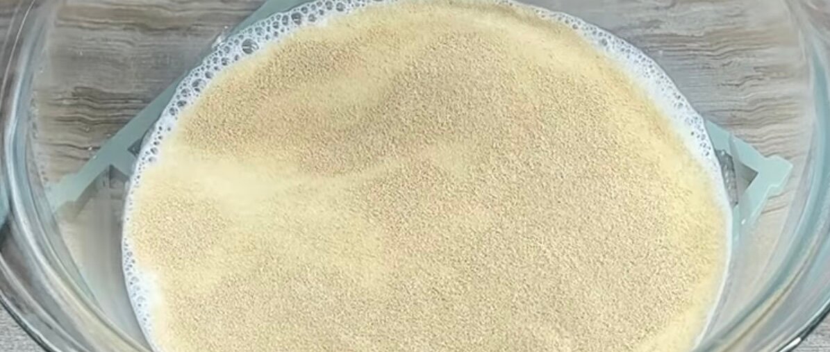 У ємність до теплого молока всипаємо цукор, дріжджі і розмішуємо до розчинення дріжджів.