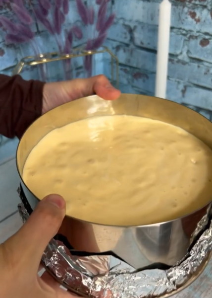 Перекладаємо масу у форму. Якщо у вас таке ж кільце як у мене, то тоді дно форми обхопіть фольгою.