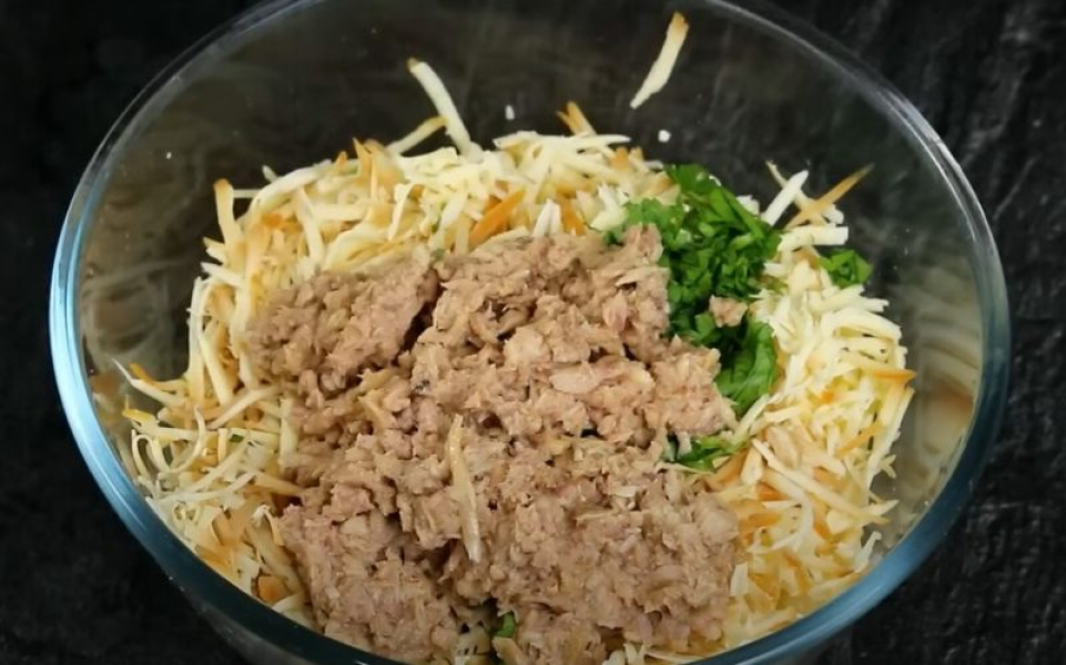 Висипаємо зелень до сиру та яєць, додаємо тунець та чорний перець.