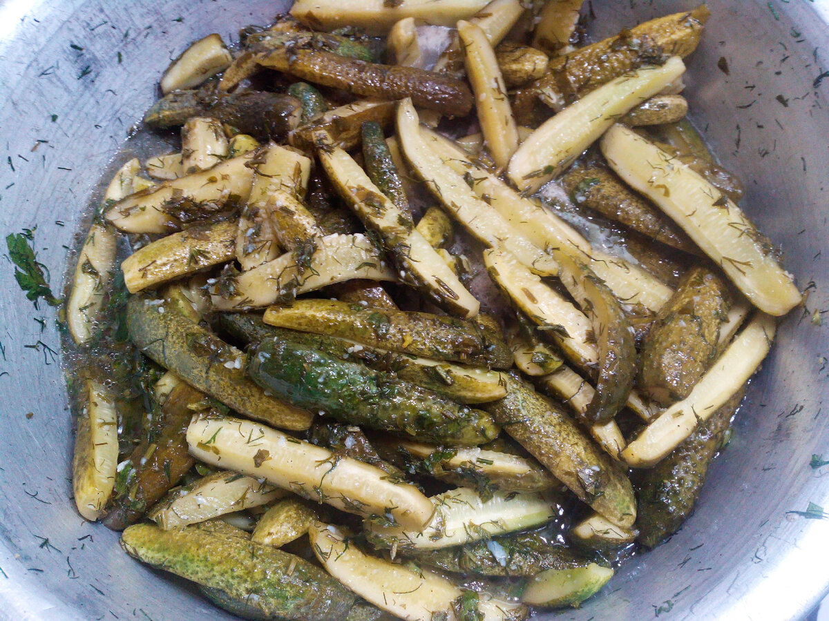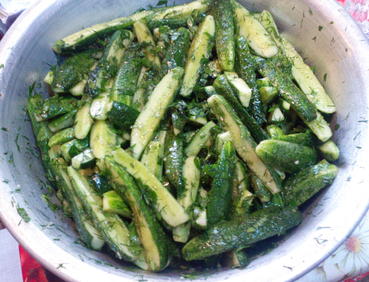 Огірки розрізаємо уздовж на 4-6 частин. Нарізаємо зелень, продавлюємо часник. Перемішуємо огірки з усіма компонентами з вищевказаного списку в емальованій посуді. Ми залишаємо, приблизно, на 1 годину, періодично перемішуючи, поки не дадуть сік.
