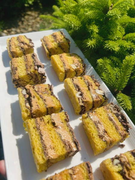 Тісто: 6 жовтків, 1 стакан цукру, 3 ст.л розтопленого масла, 3 ст.л сметани, 300 гр борошна, 1 ст.л розпушувача.