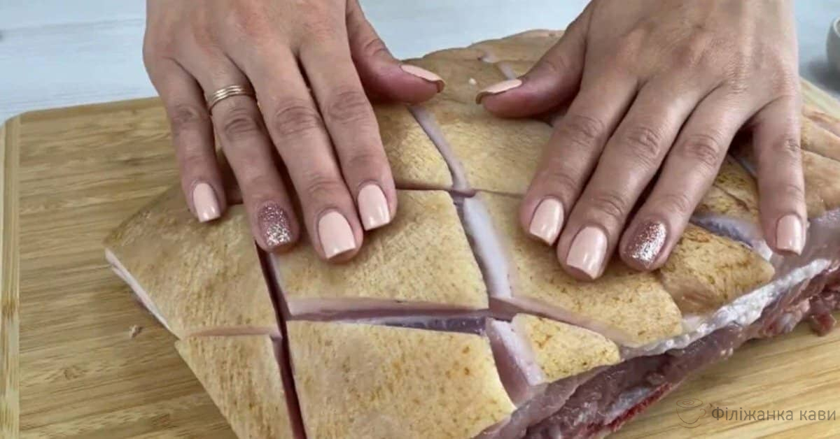Гарненько очистіть шкурку на шматочку грудинки. Потім зробіть надрізи ромбиками ( глибиною не більш 1 см ).