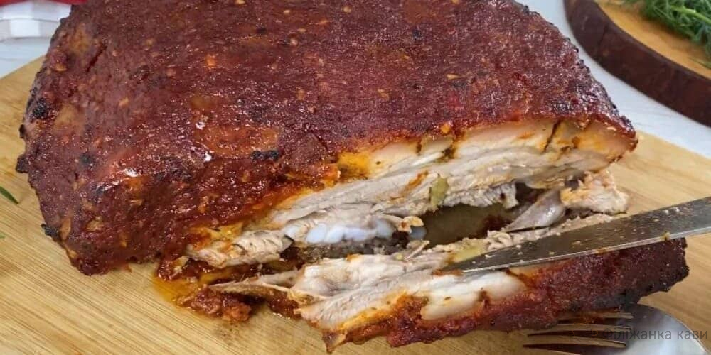 Для приготування цієї страви рекомендуємо використовувати шматок грудинки з ребрами. Не забудьте видалити зайві плівки, а потім приступайте до маринування. Якщо шкурка не дуже товста, можете її залишити. Так вийде ще смачніше!