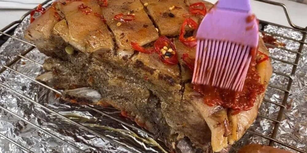 Після закінчення 2 годин дістаньте грудинку з духовки. Розріжте фольгу і перекладіть м’ясо на решітку. Покрийте його з усіх боків приготовленою глазур’ю.