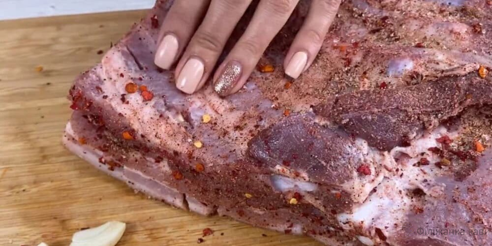 В ємності змішайте сіль, чорний і червоний мелений перець. Додайте 1,5 ч. Л. меленої паприки і 1 ч. Л. сушеного часнику. Ретельно все перемішайте. Натріть пряною сумішшю грудинку з усіх боків.