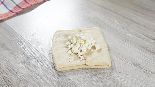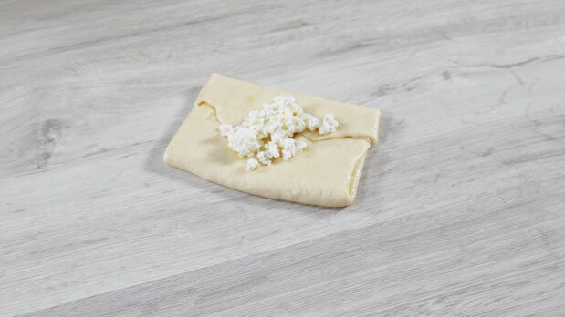 На кожну частину викладаємо по 1 чайної ложці сиру і заліплює начинку, поєднуючи краї.