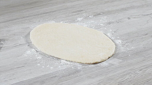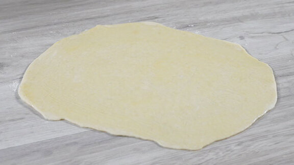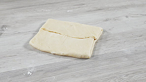 Змащуємо розтопленим вершковим маслом. Після з’єднуємо краї і змащуємо тісто, як показано на фото. Звертаємо таким чином тісто.