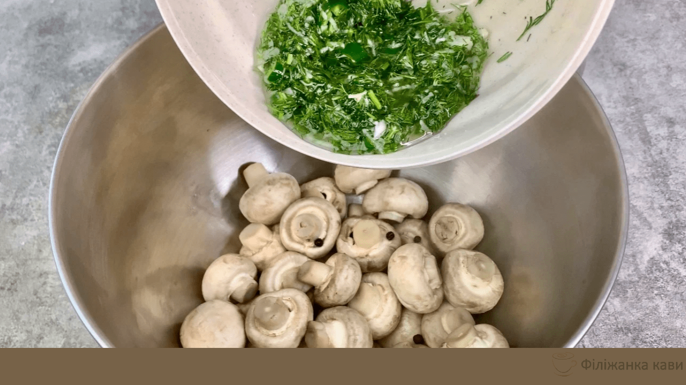 Для заправки змішуємо рубаний пучок кропу, тертий часник, кілька кілець гострого чилі, цукор, олію та яблучний оцет. Ретельно перемішуємо і вливаємо суміш до залишених раніше печериць і ретельно перемішуємо.