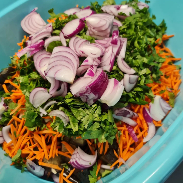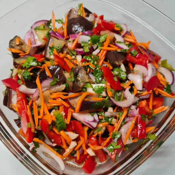 Баклажани, що остигли, нарізаємо не дрібно ~ 2× 2 см. Всі інгредієнти добре перемішуємо