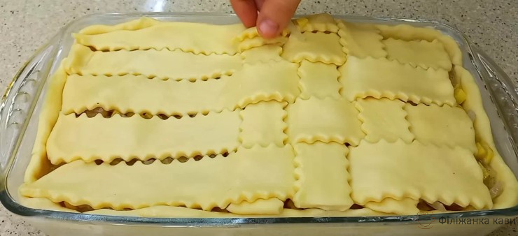 7. Викладаємо смужки на начинку (зробивши візерунок за бажанням).