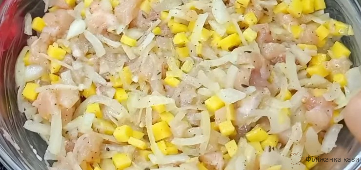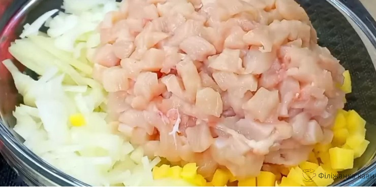3. Картоплю нарізаємо кубиками, цибулю дрібно нарізаємо викладаємо в миску. Курячі грудки дрібно нарізаємо і відправляємо в миску до овочів.