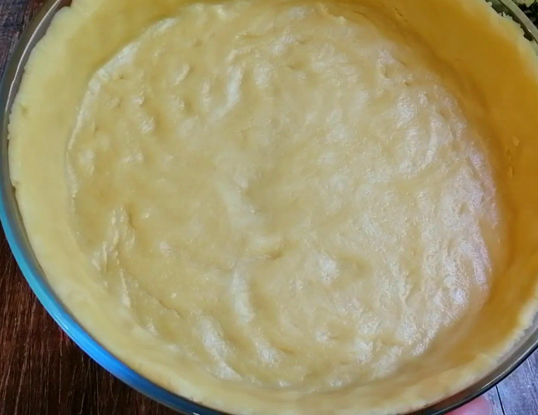 На дно форми викладаємо пекарський папір. Тісто перекладаємо у форму та розрівнюючи руками, формуємо основу пирога.