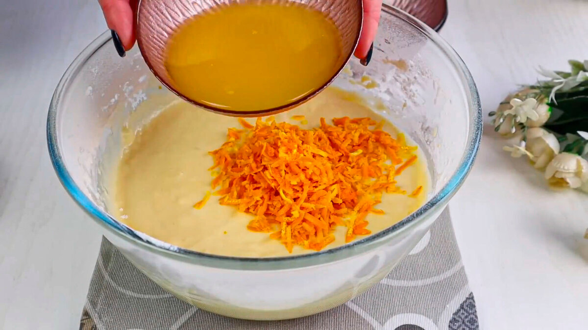 Неймовірний смак цього пирога дають 2 апельсина. Знімаємо цедру і тремо на терці. Вичавлюємо сік з апельсинів. Додаємо все в тісто і збиваємо міксером.