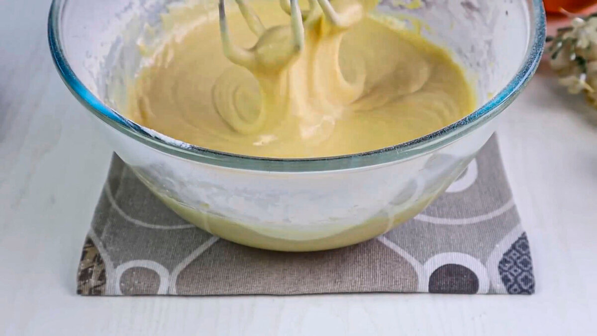 Додаємо 150 г розтопленого вершкового масла, 2 ч. л. розпушувача, просіюємо 250 г борошна. Збиваємо міксером.