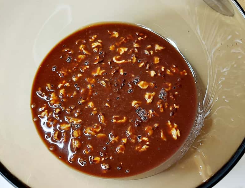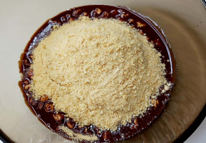 4. Волоський горіх я підсушувала в мікрохвильовій печі, півтори хвилини. Після цього добре відходить лушпиння. Прибрала лушпиння з горіха і трохи його подрібнила. Додати в шоколадну суміш. Можна використовувати будь-які горіхи або зовсім не додавати їх. Все на свій смак.