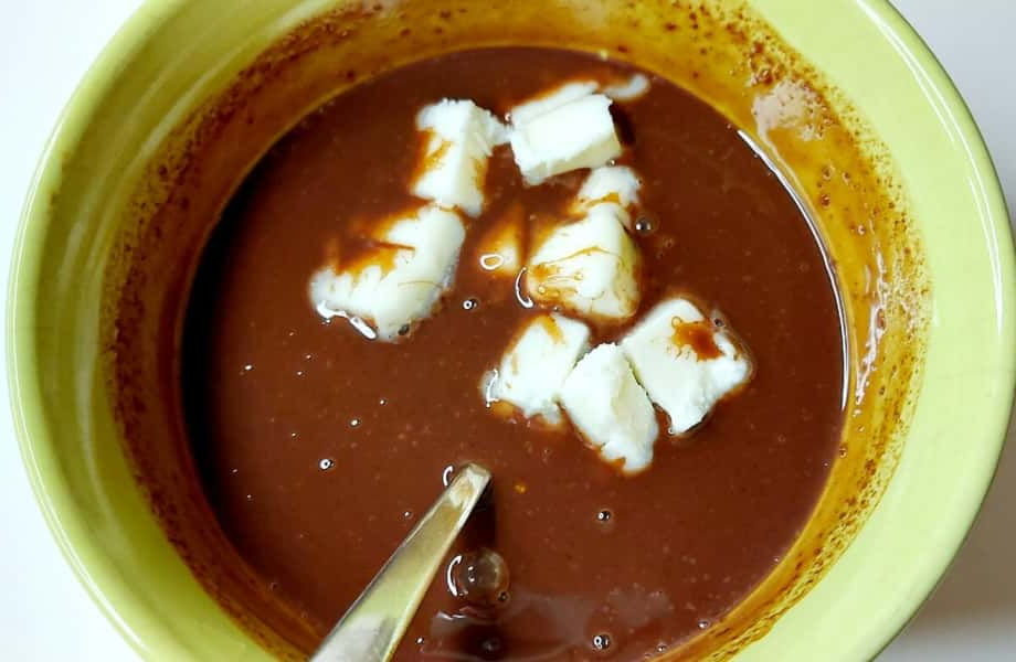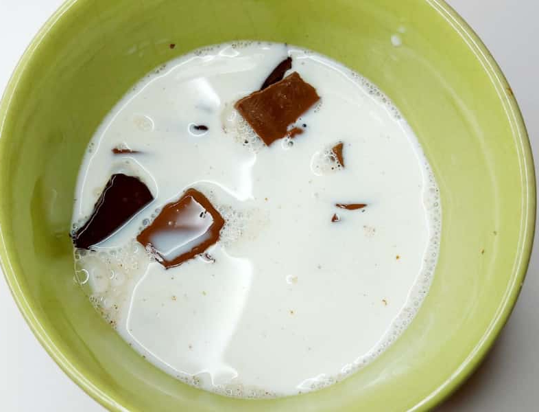 2. Шоколад залити молоком і поступово нагрівати в мікрохвильовій печі, кожні 20 секунд перемішуючи. І так, поки шоколад не розтане. Пропорції шоколаду можна регулювати на свій смак. Хто любить солодше, потрібно більше молочного шоколаду додати, а якщо навпаки, то гіркого.