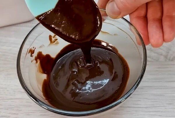 - У невеликій жароміцній мисочці нагрійте в мікрохвильовій печі 50 г шоколаду, 30 мл вершків ( 36% ) і 10 г вершкового масла. Нагрівайте пару хвилин, а потім добре розмішайте, поки шоколад повністю розтане.