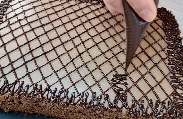 - Перекладіть шоколадний ганаш в кондитерський мішок і дайте йому трохи охолонути. Прикрасьте торт традиційною сіточкою, або по-іншому — як вам подобається.