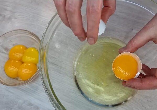 - Використовуйте для готування продукти кімнатної температури, для чого заздалегідь вийміть їх з холодильника. Розбийте в велику миску 6 яєць — одне за іншим, попутно відокремлюючи жовтки від білків. Намагайтеся, щоб жовток не потрапив в миску з білками ( це ускладнить збивання ).