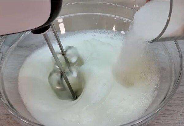 - Додайте до білків щіпку солі і починайте збивати їх за допомогою ручного міксера до густої пишної піни. Після цього поступово всипте в миску цукор і продовжуйте збивати на великій швидкості «до гострих піків» — тобто до густого глянцевого стану білків.