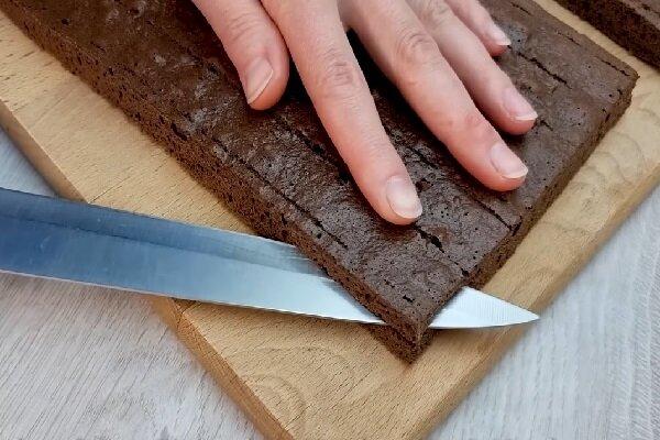 - Покладіть прямокутні бісквіти один на інший, потім обріжте їх по краях, щоб вони були однакового розміру ( обрізки збережіть ), після чого гострим довгим ножем розріжте кожен з них горизонтально.