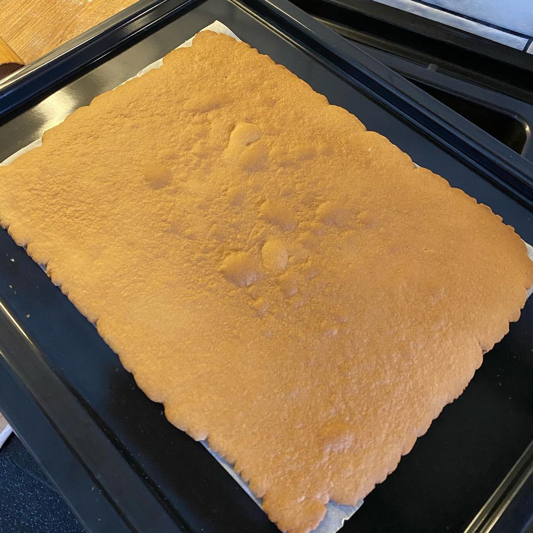 - Тісто ділимо на 5 частин. З пергамента вирізаємо 6 однакових прямокутників (5 для медового і 1 для макового тіста) розміром 24*33 см. Кожну 1/5 частину медового тіста розкачуємо по розміру пергамента та випікаємо при t180℃ до золотистого кольору (у мене випікався 7-8 хв.).