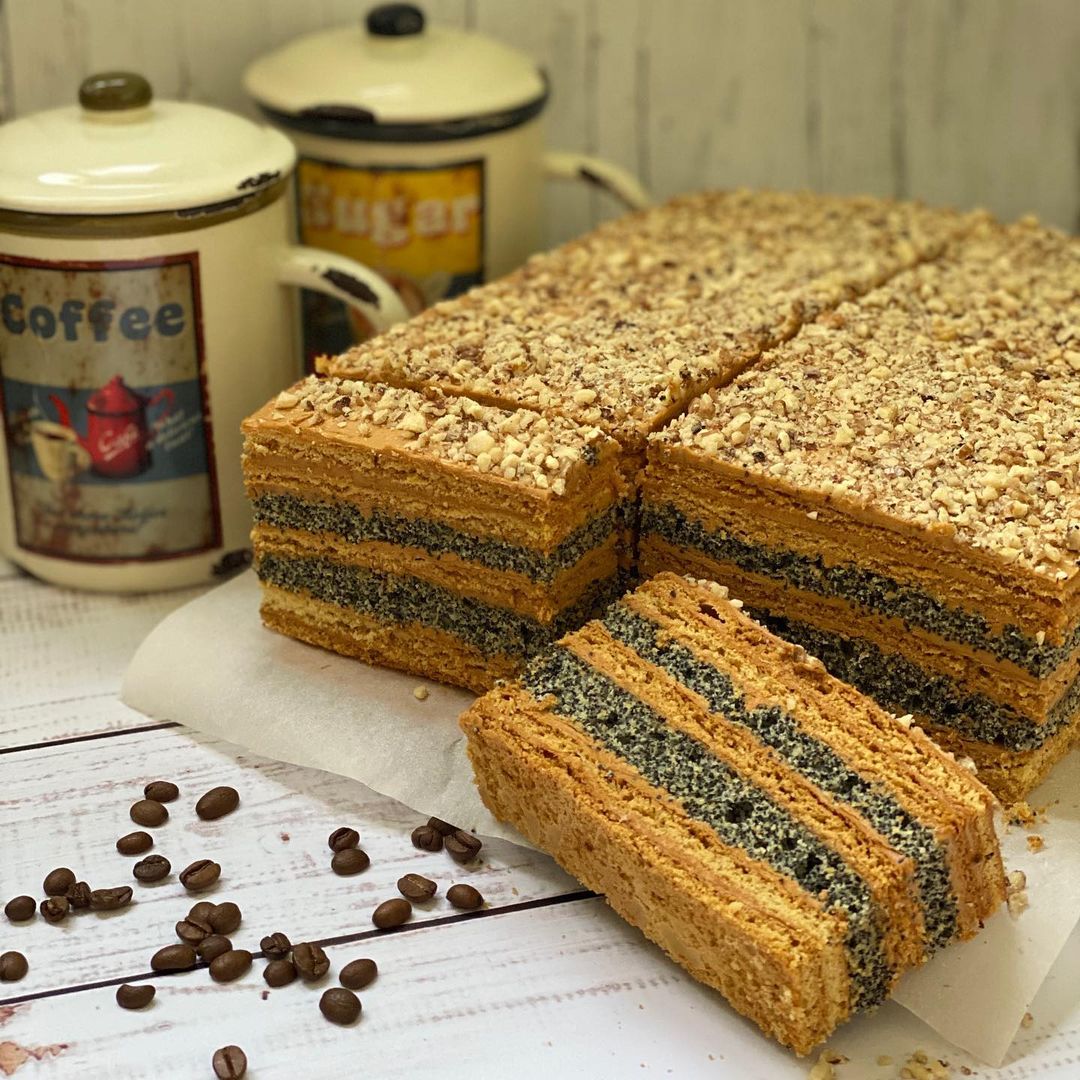 - Кожен корж перемащуємо кремом і складаємо в такій послідовності: 2 медові – 1 маковий – 1 медовий – 1 маковий – 2 медових.