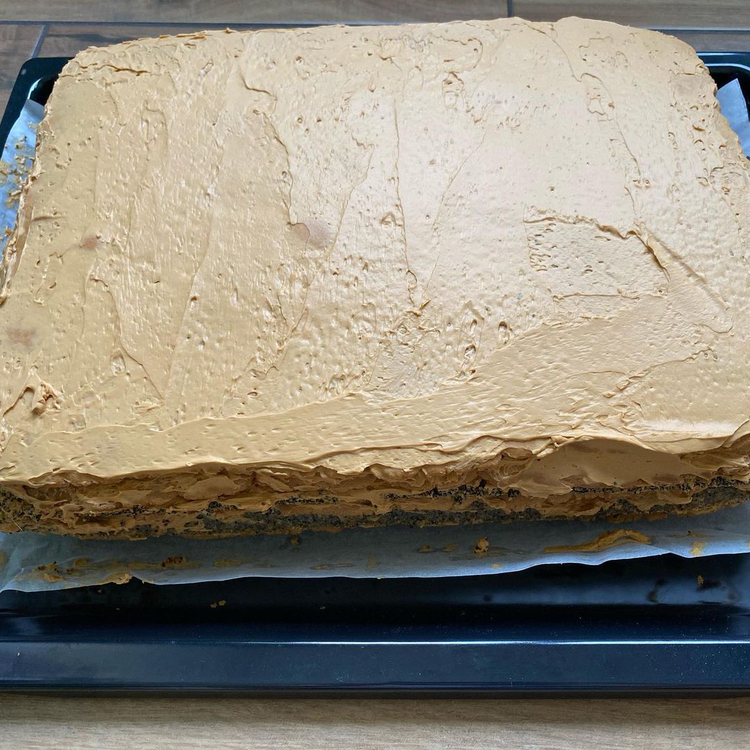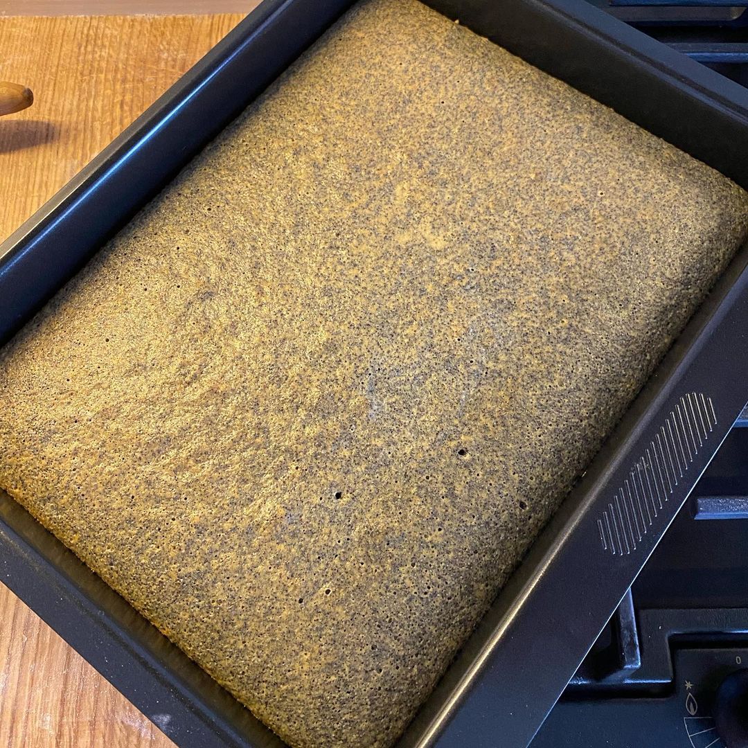 - На дно форми з бортиками кладемо пергамент, виливаємо тісто та випікаємо при t 150℃ до готовності. У мене випікався 30 хв., але перевіряйте дерев’яною шпажкою. Коли маковий корж вистигне, розріжте його вздовж на 2 частини.