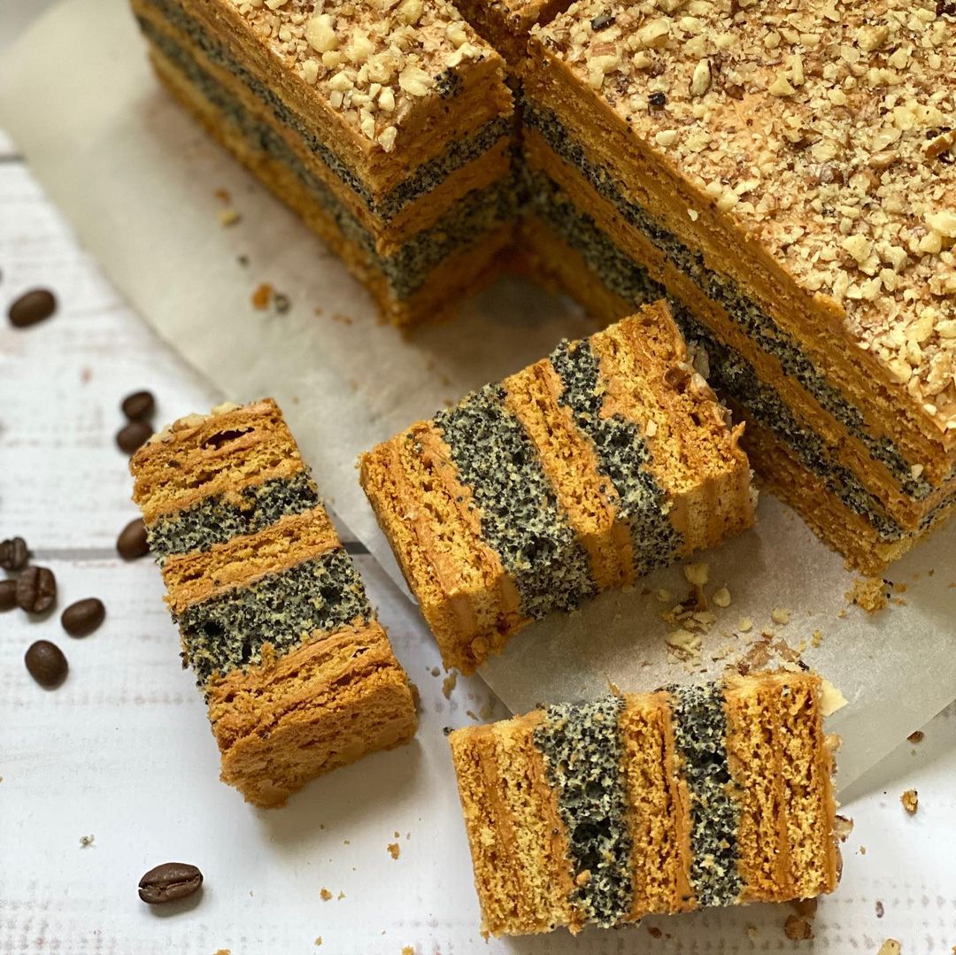 - Кожен корж перемащуємо кремом і складаємо в такій послідовності: 2 медові – 1 маковий – 1 медовий – 1 маковий – 2 медових.
