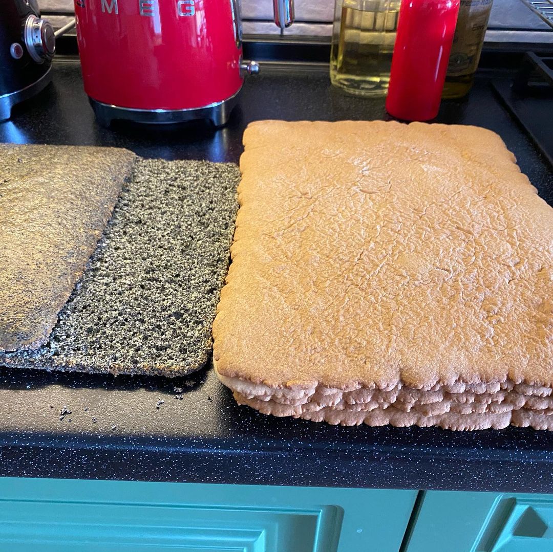 - Тісто ділимо на 5 частин. З пергамента вирізаємо 6 однакових прямокутників (5 для медового і 1 для макового тіста) розміром 24*33 см. Кожну 1/5 частину медового тіста розкачуємо по розміру пергамента та випікаємо при t180℃ до золотистого кольору (у мене випікався 7-8 хв.).