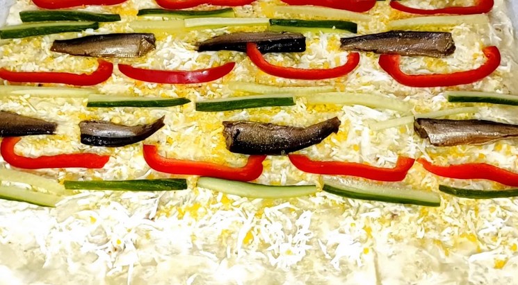 - Потім викладаємо шпроти в олії з болгарським перцем та огірком.