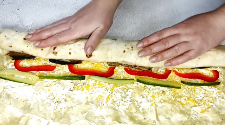 - Зверху посипаємо натертим плавленим сиром і накриваємо другим лавашем.