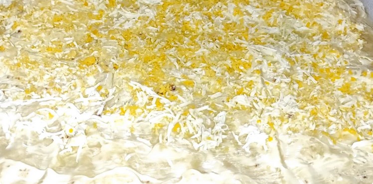 - Знову змащуємо майонезом та посипаємо натертим на дрібній терці відвареними яйцями.