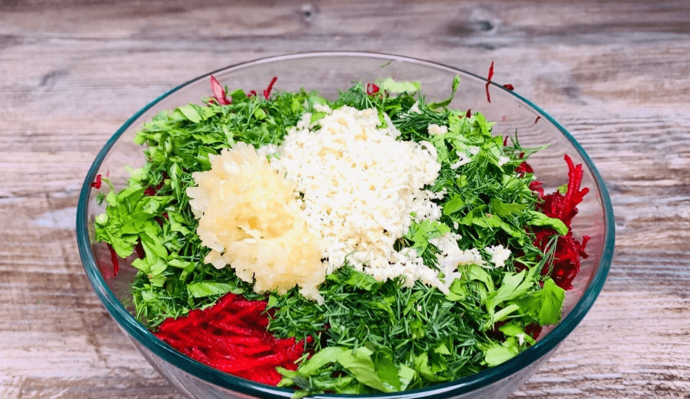 6. Додаємо до буряків зелень, корінь хрону та часник. Все добре перемішуємо.